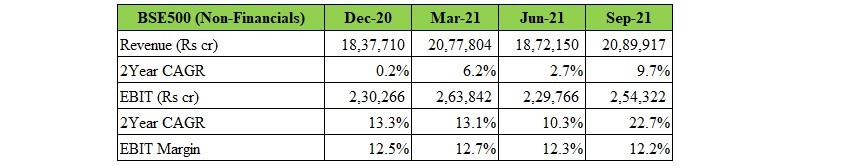 Most of the companies in our BSE-500 non-financials cohort have reported earnings for the quarter ended 30-Sep-21 and as promised last time, we would like to spend some time looking at these numbers.