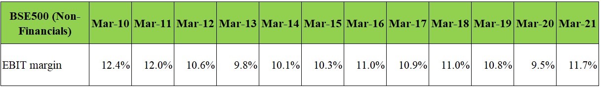Revenue growth of 9.7% suggests that the corporate sector is reporting numbers which are as good as normal, and when you consider that in the context of the pandemic, it is quite surprising. A very significant contributor to the high EBIT growth in the Sep-21 quarter is the ‘Material’ sector which contains steel and non-ferrous metals as big contributors to the total. If we were to exclude the Material Sector, EBIT growth would drop to 12.5%, which though significantly lower, is still healthy. This throws up some interesting questions – is this pent-up demand? Or are we witnessing a turn in the economy which has been patchy for several years now? These questions will perhaps get fully answered only with the passage of time and when we have more data at our disposal.