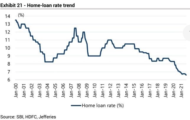 We now look at the property sector because it plays a pivotal role in the economy through its linkage with a large number of industries as also the employment it generates in the economy. The property sector has been in a funk for the last several years – the property cycle peaked in 2012 and although there has not been a major drop in prices – the passage of 9 years and a flat lining in prices have meant that affordability of homes is at a multi-year high. Interest rates on housing loans are at a two-decade low as one can see from the graph below: