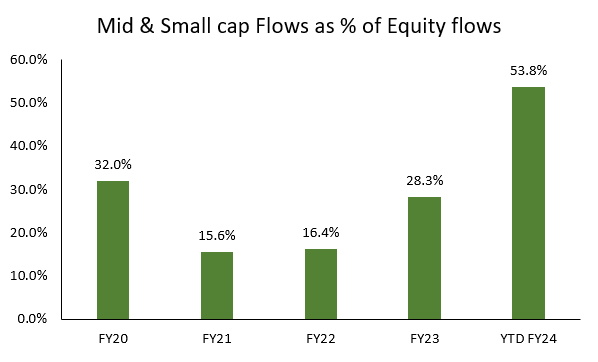 First, we have a look at the domestic money that has poured into small-cap and mid-cap funds. For the financial year to date up to August 2023, as much as 53.8% of the total inflows into domestic equity mutual funds flowed into mid-cap and small-cap funds.