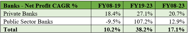 From FY2008 to FY2019 the banking sector recorded relatively muted growth in earnings at 10.2% pa. This is largely because while the private sector banks reported a healthy 18.4% pa growth, the profits of the public sector banks de-grew at 9.5% pa over this period. This was a result of the banks being forced to recognize NPAs of the past, which depressed earnings for FY2019. From FY2019 to FY2023, there has been a very strong growth in profits for banks, particularly PSU banks. However, over the entire period FY2008 to FY2023, private banks have continued to outpace PSU banks.